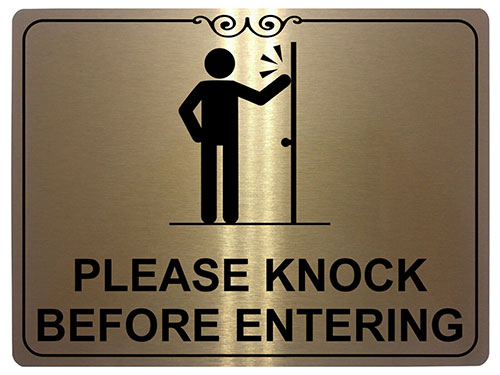 Please Knock Signage seperti ini bisa anda gunakan untuk ruangan meeting atau ruangan jajaran direksi dan manajemen. Warning signage seperti ini sebenarnya tidak begitu menandakan ‘bahaya’. Namun jenis warning signage seperti contoh berikut akan membantu memberikan informasi bahwa aktivitas dalam ruangan tersebut tidak dapat menerima tamu secara mendadak.