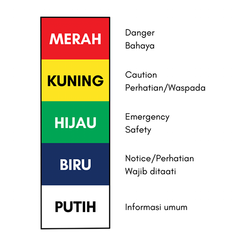 Warning signage ini biasanya dibagi dalam 5 warna. Setiap warna memiliki maknanya tersendiri. Merah menandakan bahaya, kuning menandakan perhatian, hijau menandakan emergency safety, biru menandakan notice/perhatian dan putih merupakan informasi umum. Kelimanya tentu dapat disesuaikan dengan kebutuhan area perkantoran anda.