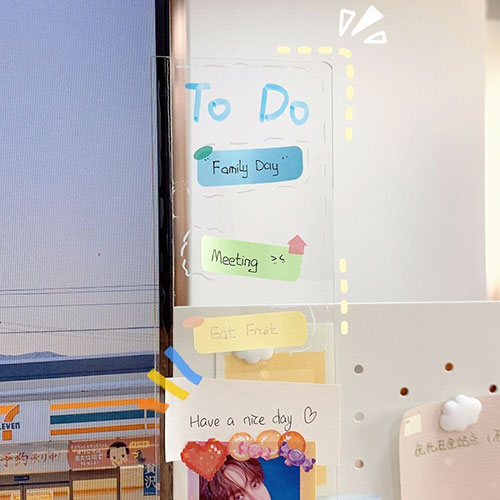 Di urutan ketiga, perlengkapan sekolah yang juga membantu anak adalah acrylic monitor message. Jadi akrilik ini berbentuk persegi panjang dan biasanya dipakai untuk menempel memo di sebelah layar komputer. Fungsi dari perlengkapan ini adalah agar anak punya media pengingat di area meja belajarnya. Wahhh cukup inovatif yah produk satu ini.