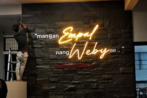 Custom neon flex berikut merupakan salah satu portfolio Laserfox sebagai jasa neon flex Surabaya. Tagline milik Weby Surabaya ini tidak dibuat full menggunakan neon flex. Namun pada kata Empal Weby saja yang ingin dihighlight saat itu. Tagline memang tidak selalu menggunakan neon flex secara keseluruhan.