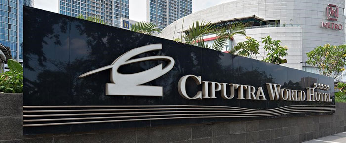 Bisa dilihat signage milik Ciputra World Hotel yang terpampang besar di pinggir jalan merupakan salah satu contoh yang menarik perhatian. Penempatan yang strategis dan ukuran yang besar membuatnya menjadi titik fokus yang tidak terlewat oleh pengunjung maupun pengendara yang melewati lokasi tersebut. Dengan menampilkan tulisan yang jelas dan mencolok, yaitu 'CIPUTRA WORLD HOTEL', signage ini berperan sebagai identitas visual yang kuat bagi hotel tersebut.